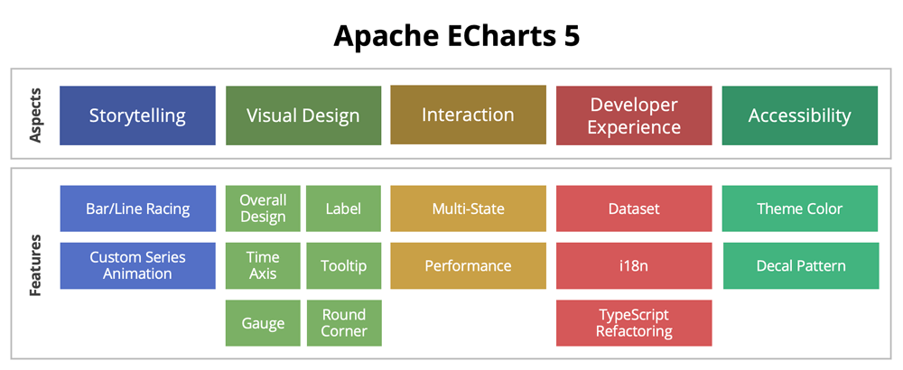 "The core of Apache ECharts 5 is "Show, do not tell", which is a comprehensive upgrade of five topics and 15 features around the stroy telling of visualizations, allowing charts to better tell the story behind the data. It helps developers to create visualizations that meet the needs of various scenarios more easily.